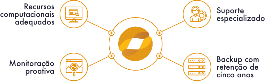 Os principais recursos dos servidores, como processador, memória e espaço em disco, são monitorados constantemente (24x7x365). Além disso, a gestão da conectividade inclui abertura e acompanhamento de chamados junto às operadoras dos links de comunicação.
